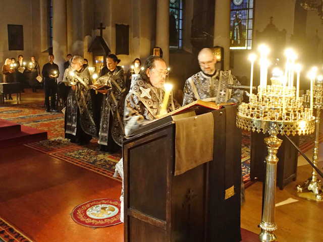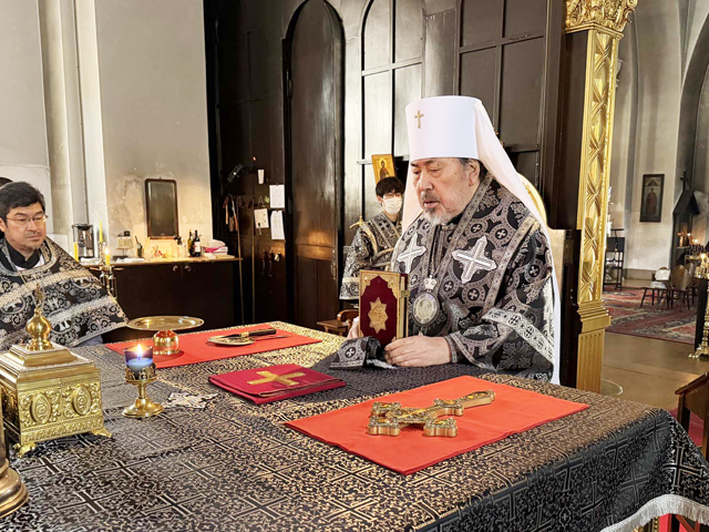 今年の生神女福音祭は受難週・聖大火曜日に重なることから奉事規程・奉神礼指示書に則り、前晩には晩堂大課・祭日リティヤから早課・1時課まで、祭日当日には時課・晩課に続けて金口イオアンの聖体礼儀を執行した。